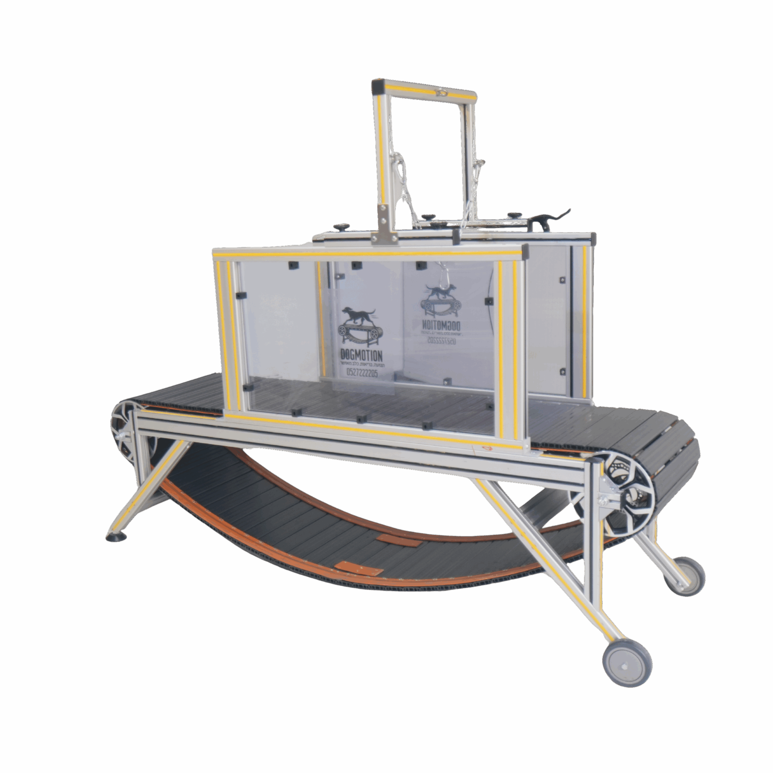 השלדה עשויה מאלומיניום חזק וקל משקל, שאינו מחליד גם לאחר שימוש ממושך. היא מעניקה יציבות מושלמת לצד ניידות קלה, ומעוצבת במראה יוקרתי ודיוק הנדסי. המסוע הפולימרי המחוזק גמיש במיוחד, סופג זעזועים באופן טבעי ומאפשר לכלב ריצה חלקה ובריאה. השקט של המסוע תורם לתחושת ביטחון ורוגע – גם עבור כלבים רגישים או בשלבי שיקום.